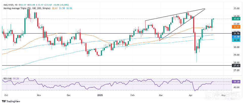 【华通白银网4月25日讯】•在美元走弱和债券收益率下降的支撑下,周四白银保持稳定。 •在全面降低关税的不确定性挥之不去之际,交易员关注上行空间。 •美联储官员仍持谨慎态度,在经济日益不明朗的情况下发出了依赖数据的信号。 银价周四收盘基本持平,但仍接近33.65美元的周高,交易商准备推高银价。 白银守在33.65美元,因美联储的不确定性和美国国债收益率下跌提振贵金属,尽管关税减免的希望存在 白银价格仍受到美国国债收益率下跌的支撑。美元指数下跌0.50%,至99.28。 美国经济数据显示,在最新初请失业金人数公布后,劳动力市场保持稳定,该数据与预期相符。美国3月份耐用品订单打破了2%的预期,由于运输订单的激增,美国耐用品订单环比增长9.2%。 以Waller为首的众多美联储发言人占据了新闻头条。Waller表示,7月份不太可能知道关税的影响,并补充称,2025年下半年将更加清晰。克利夫兰联邦储备银行Beth Hammack表示,不确定性正在给企业带来压力,如果数据证明这一点,美联储的下一步行动可能在6月。 白银价格预测:技术展望 在此背景下,银价可能维持在本周高位附近,但多头需要清除关键阻力位。第一个上限将是34.00美元,其次是今年迄今高点34.58美元。一旦清除这两个水平,则可以瞄准35美元。 反之,如果白银跌破33.00美元,空头将尝试测试50日简单移动均线32.63美元。一旦清除,下一个支撑位将是32美元。