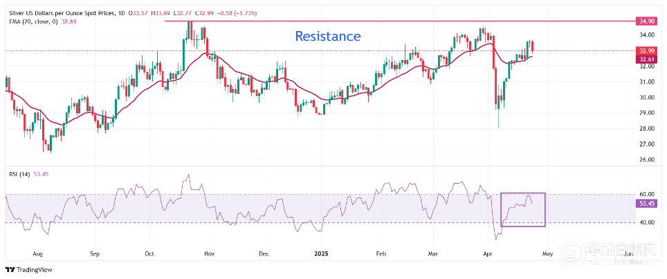 【华通白银网4月28日讯】•美国频繁释放中美关税谈判消息,白银价格大幅下跌至33.00美元附近。 •中方否认与美国进行任何经贸谈判。 周五北美交易时段,白银价格暴跌逾1.5%,接近33.00美元。银价从当日早些时候创下的三周高点33.70美元大幅下跌。随着美国频繁释放中美关税谈判消息,白银走弱。 投资者认为这种情况对全球经济前景有利。从理论上讲,全球经济前景的改善会减少对白银等避险资产的需求。 与此同时,美元在周四大幅调整后已经反弹。美元指数回升至接近99.75。 然而,中方否认与美国进行任何经贸谈判,预计这将使投资者保持观望。特朗普一直表示,华盛顿和北京之间关于贸易的讨论进展顺利,而中方否认了这些言论,称“中美之间没有任何经济和贸易谈判”。 白银技术分析 银价在创下约33.70美元的三周新高后大幅下跌。然而,白银的短期前景仍然看涨,守住20日EMA,位于32.60美元附近。 14日相对强弱指标(RSI)努力突破60.00上方。如果相对强弱指标突破该水平,将出现新的看涨势头。 上方,3月28日高点34.60美元将成为白银的关键阻力位。下方,4月11日低点30.90美元将是关键支撑区域。 白银日线图