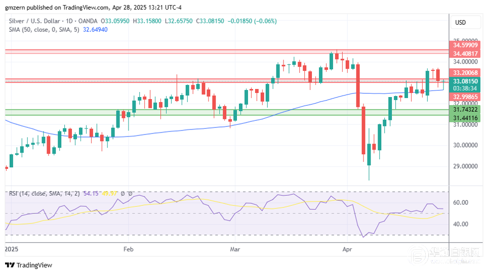 金价走高,因交易商对美元回调作出反应,并关注美国国债收益率下滑。 如果金价能够收于阻力位3350-3360美元上方,则将朝着下一个阻力位3490-3500美元前进。 白银