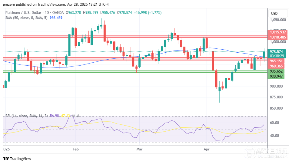 铂金攀升至960-965美元阻力位上方,并试图收于980美元上方。 如果这一尝试成功,铂金将走向下一个阻力位1010-1015美元。 白银网 |
