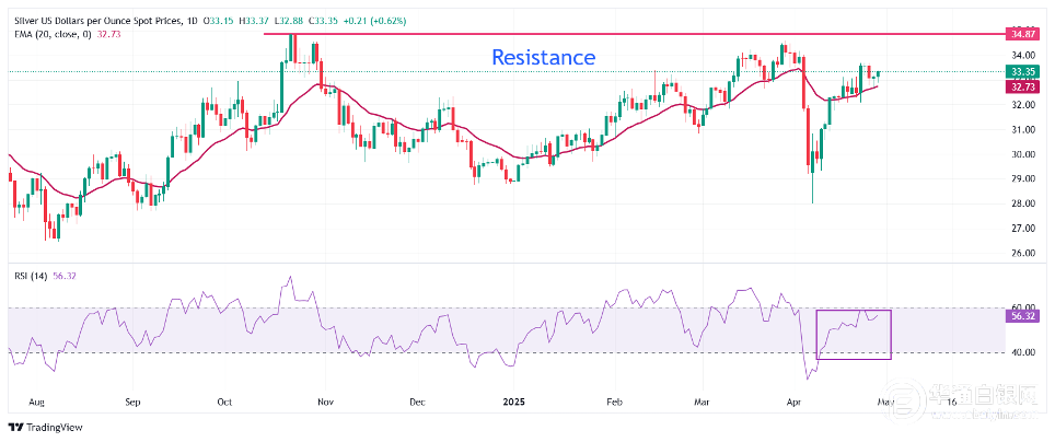 【华通白银网4月30日讯】•由于中美贸易关系的不确定性,白银价格上涨至33.30美元附近。 •投资者等待美国3月份的就业空缺数据。 周二欧洲交易时段,银价上涨至33.30美元附近。随着投资者担忧中美贸易战未能缓和,白银上涨。 美国财政部长贝森特表示,中国应该是启动贸易谈判的一方,这一言论给中美贸易关系带来了新的不确定性。贝森特接受美媒CNBC采访时表示,“我认为中国应该率先给(贸易紧张)局势降温,因为他们向我们出售的商品是我们向他们出售的商品的五倍。”然而,贝森特表示,与其他国家的贸易谈判进展顺利。 虽然贝森特的言论表明,贸易战将主要在中美之间展开,但预计这种对峙将使全球经济紧张局势加剧。理论上,当对全球经济动荡的担忧加剧时,白银价格会表现强劲。 与此同时,美国3月份JOLTS职位空缺数据公布,在此之前美元走高。美元指数走高,接近99.30。投资者预计美国雇主发布了750万个就业岗位,略低于2月份的756万个。 本周,投资者将密切关注一系列美国经济数据,包括非农就业数据(NFP),这将影响市场对美联储货币政策前景的预期。 白银技术分析 银价的目标是重新触及约33.70美元的逾三周高位。由于白银守住20日EMA,近期前景依然看涨,20日EMA约为32.73美元。 14日相对强弱指标(RSI)挣扎着突破60.00上方。如果相对强弱指标突破该水平,将出现新的看涨势头。 上方,3月28日高点34.60美元将成为白银的关键阻力位。下方,4月11日低点30.90美元将是关键支撑区域。 白银日线图