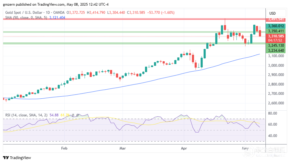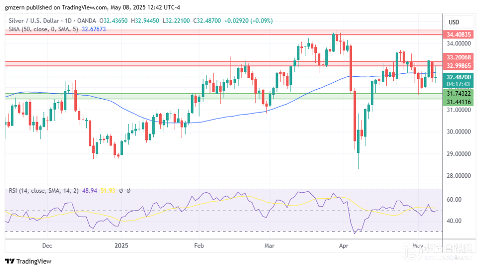 在美国宣布与英国达成贸易协议后,对避险资产的需求下降,黄金价格下跌。 跌破3300美元将推动黄金向下一个支撑位3235-3245美元移动。 白银