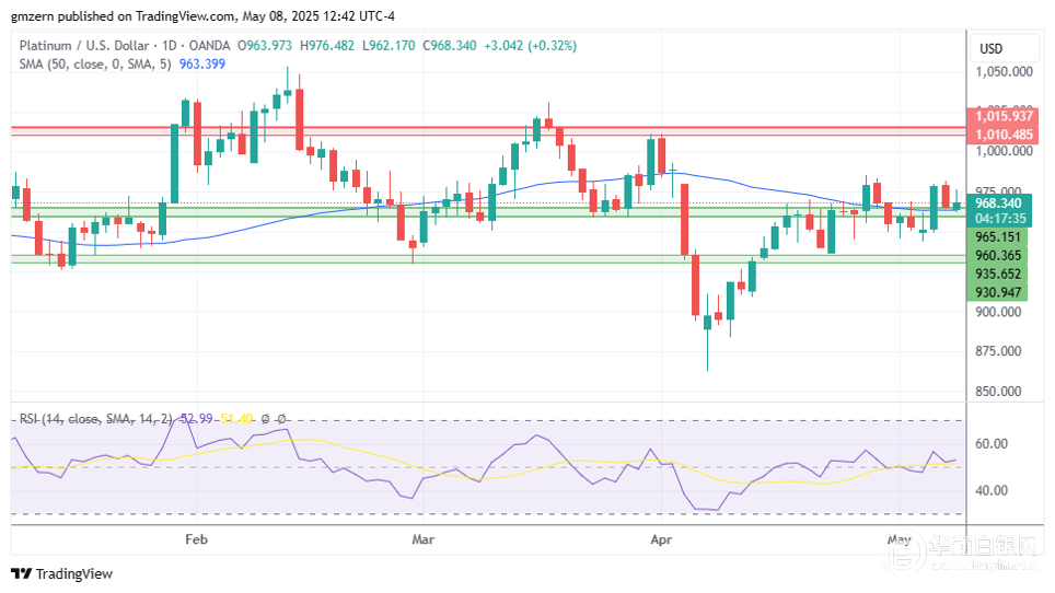 由于交易员关注钯金市场的强劲表现(上涨1.3%),铂金也小幅上涨。 如果铂金成功收于980美元上方,则将向下一个阻力位1010-1020美元前进。 白银网 |