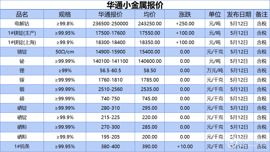 华通白银网5月12日讯:电解钴、1#镁锭(生产)、1#镁锭(上海)、锗锭、铋、锂、镓、铟、碲、硒锭(99.99%)、硒锭(99.9%)、硒粉、硒粉(99.9%)、1#钨条报价