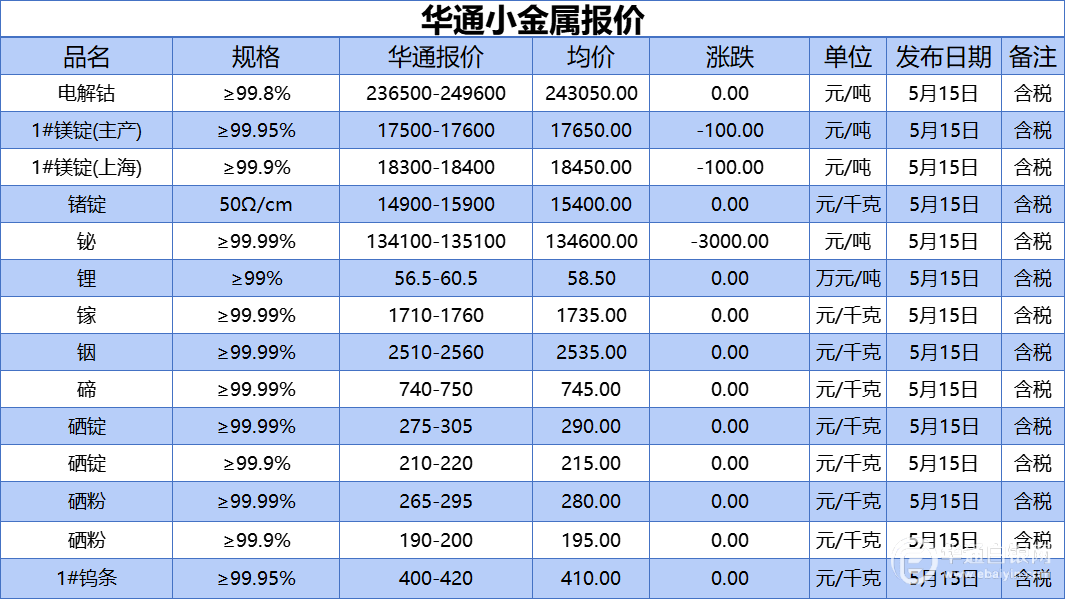 华通白银网5月15日讯:电解钴、1#镁锭(生产)、1#镁锭(上海)、锗锭、铋、锂、镓、铟、碲、硒锭(99.99%)、硒锭(99.9%)、硒粉、硒粉(99.9%)、1#钨条报价