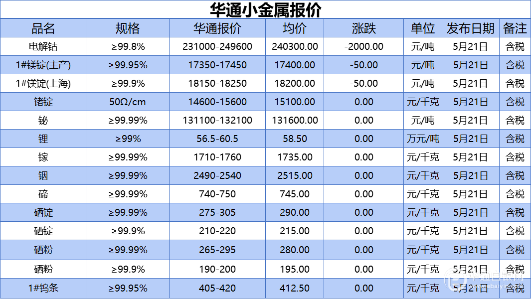 华通白银网5月21日讯:电解钴、1#镁锭(生产)、1#镁锭(上海)、锗锭、铋、锂、镓、铟、碲、硒锭(99.99%)、硒锭(99.9%)、硒粉、硒粉(99.9%)、1#钨条报价