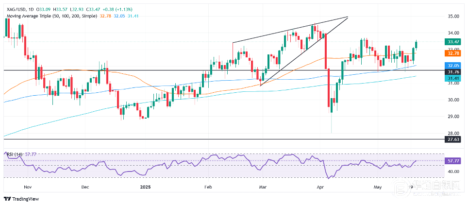 【华通白银网5月22讯】•穆迪下调评级、美国预算投票打压市场情绪,银价上涨。 •相对强弱指标保持看涨;突破33.50美元的下一个目标可能是34.00美元。 •跌破33.00美元有进一步回调至100日和200日移动均线的风险。 周三,由于美元继续全面走弱,白银价格延续了三天的涨势,小幅上涨0.21%。穆迪下调美国主权债务评级,以及美国财政预算投票通过,促使投资者在白银中寻求避险。截至撰写本文时,白银价格为33.45美元。 白银价格预测:技术展望 银价当日稳定在33.00-33.50美元区间内,周三收于33.40美元附近。相对强弱指标(RSI)利好多头,这意味着决定性地突破关键阻力位可能为挑战34.00美元铺平道路。 而如果白银跌破33.00美元,则将打开挑战100日移动均线31.98美元的道路,随后将测试200日移动均线31.30美元。 白银日线图