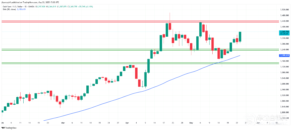 (黄金日线图) 在特朗普威胁对欧盟进口商品征收50%的关税、重新引发地缘政治紧张局势后,受避险需求推动,黄金当日上涨2.15%,至3365美元。美元指数下跌0.7%,令黄金对其他国家的买家更具吸引力。市场情绪已转为防御,股市承压,黄金吸引新的买盘。 从技术面看,现货金已从3,240美元附近的支撑位强劲反弹,目前正接近3,400-3,450美元的阻力位。根据RJO Futures的数据,突破3,500美元可能会推动金价向3,800美元上涨。由于金价稳定在50日移动均线3199美元上方,短期趋势仍然看涨。 白银
