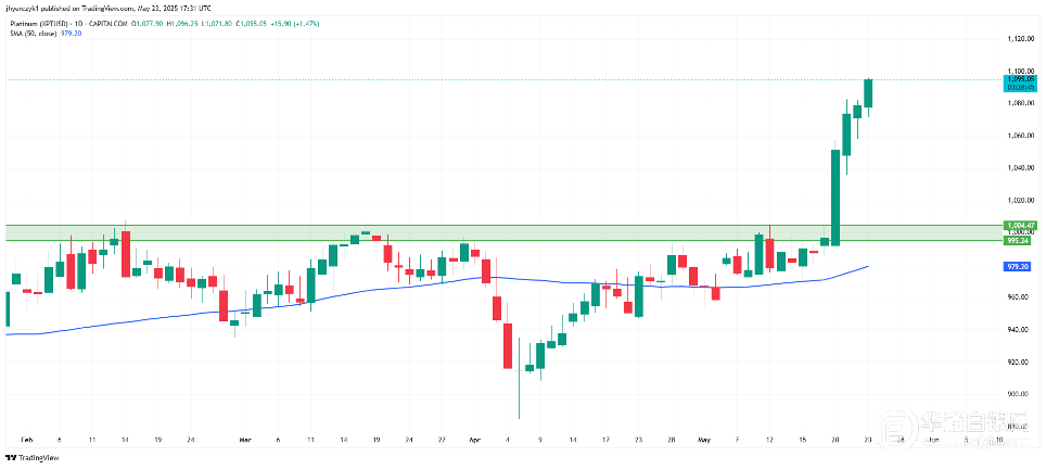 (铂金日线图) 铂金继续突破,上涨1.47%,至1,095美元。在本周早些时候突破1,000美元关口后,投机性买盘有所抬头。中国需求仍是主要推动力,4月份进口环比增长47%。 供应收紧以及投资者从高价黄金转向相对便宜的铂金,支撑了金价的上涨。尽管技术面在50日移动均线979美元上方保持强劲,但交易商指出,地上库存上升可能限制铂金的持续上行空间。如果铂金在收盘时守住1,090-1,100美元区域上方,则有望进一步上涨。 白银网 |