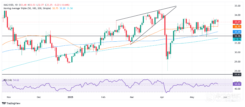 【华通白银网5月28讯】•白银在触及两日低点后下跌0.70%;看涨势头在50日移动均线上方保持不变。 •白银在32.77美元找到支撑,相对强弱指标表明仍受到多头掌控。 •关键阻力位33.69美元必须清除才能达到目标34.58美元和35.00美元。 •若日收盘价低于32.90美元,则可能开启通往100日和200日移动均线的道路。 周二,白银价格下跌0.70%,但已经减少了早些时候的部分跌幅,白银此前曾被推低至33.00美元以下,触及32.77美元的两天低点。截至撰写本文时,白银价格为33.29美元。 白银价格预测:技术展望 银价连续第三天在区间内盘整,上行受到阻力位5月22日峰值33.69美元的限制,下行受到50日简单移动均线32.73美元的限制。 正如相对强弱指标(RSI)所示,动量表明多头处于主导地位。然而,他们必须清除33.69美元,这可能为挑战34美元铺平道路。如果进一步走强,白银的下一个阻力位将是3月26日高点34.58美元,随后是35.00美元。 在看跌的情况下,白银日收盘价需要低于5月23日的低点32.90美元。在这种情况下,下一步将测试50日简单移动均线32.73美元。决定性的突破将暴露100日移动均线32.11美元,随后是200日移动均线31.40美元。 白银价格日线图