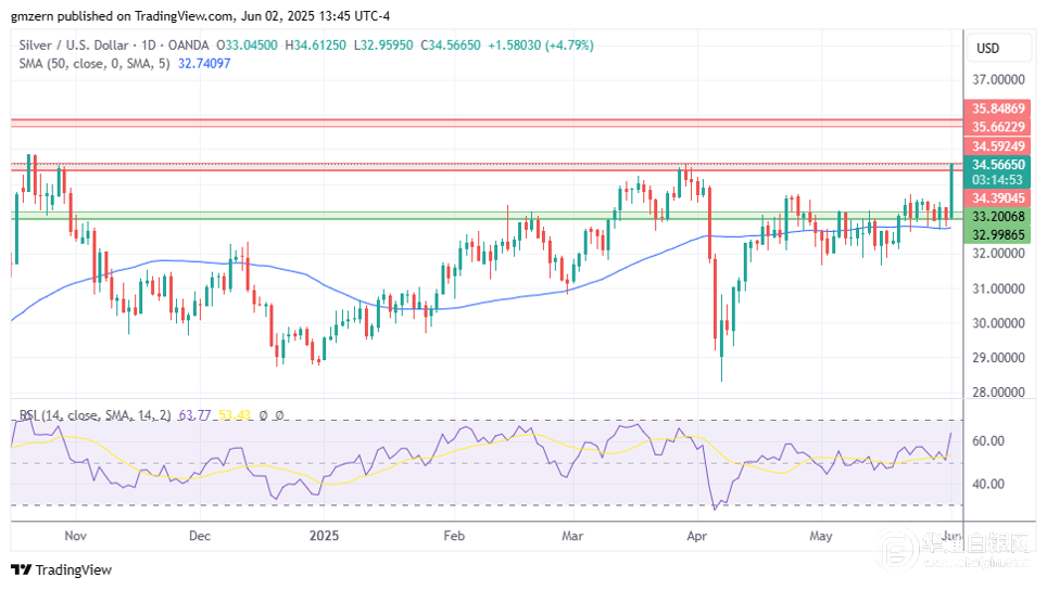 交易员关注美元走弱和地缘政治紧张局势加剧,金价上涨。对贸易战的担忧为黄金市场提供了额外支撑。 如果金价稳定在阻力位3350-3360美元上方,则将向下一个阻力位3490-3500美元挺进。 白银