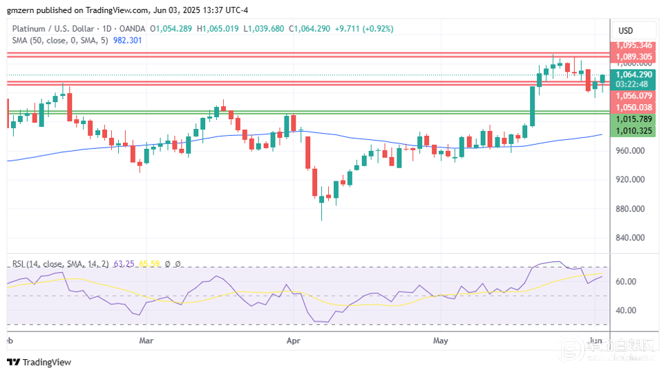 铂金攀升至1055美元上方,并试图收于1065美元上方。钯市场上涨2.5%,利好铂金。 如果铂金突破1065美元,则将向1090-1095美元阻力位前进。 白银网 |