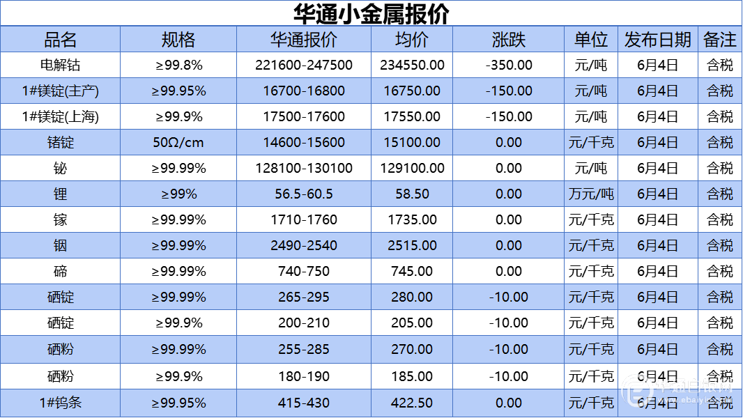华通白银网6月4日讯:电解钴、1#镁锭(生产)、1#镁锭(上海)、锗锭、铋、锂、镓、铟、碲、硒锭(99.99%)、硒锭(99.9%)、硒粉、硒粉(99.9%)、1#钨条报价