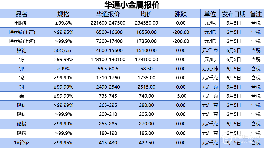 华通白银网6月5日讯:电解钴、1#镁锭(生产)、1#镁锭(上海)、锗锭、铋、锂、镓、铟、碲、硒锭(99.99%)、硒锭(99.9%)、硒粉、硒粉(99.9%)、1#钨条报价